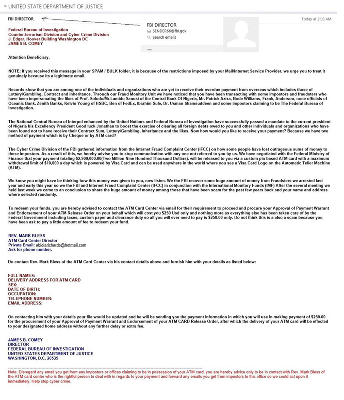 I spent time reading spam email for fun because it show funny and stupid the spam emails are even they are spam but they fun to read. In some cases they are trying to be legit on the spam section e.g. using your real name (how do they know) I can still notice it. In this one I saw this FBI scam claim to be authentic from the Director of FBI himself but I knew it was a spam. If you read the screenshot the spam email want you to take them seriously.